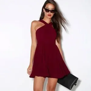 Lulus Exclusive! Our hearts will belong to the Lulus Forevermore Burgundy Skater Dress 'til the end of time! Semi-sheer shoulder straps form a modified halter neckline atop a fitted bodice with princess seams. A flirty skater skirt, composed of lightweight Georgette, flares below a banded waist. Hidden back zipper/clasp.
