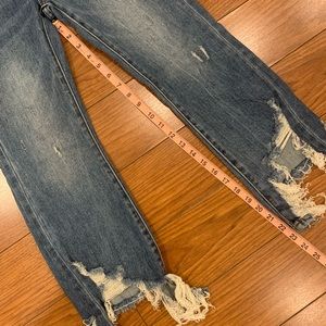 R13 High Rise Distressed Hem Crop Denim Jeans. These jeans feature extreme distressed/fringe details along the hemline for an edgy, funky look!