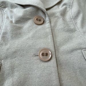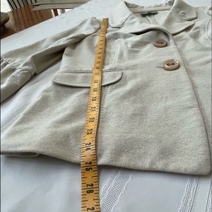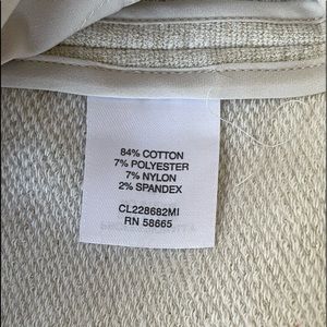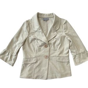 Cute and versatile jacket / blazer from Classiques Entier, a brand sold at Nordstrom. Top off your favorite dress, skirt, slacks or jeans with this cute jacket. Natural / off-white colored knit fabric, with a faint gold thread running through it for a touch of sparkle which was difficult to capture in the photos. 3/4 length sleeves with wide ruffle. Two button front with flap pockets. Very gently preowned, and probably never worn, as the pockets and pleat in back have not been unstitched. Ladies size XL. Please see photos for flat measurements.