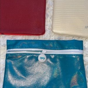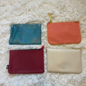 Four Ipsy bags. like new condition. 3 are perfect one has a tiny bit of wear inside as shown in pictures. The blue one has beautiful a metallic shine. The peach one has little sparkle detail shown in video.