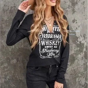 Whiskey Sweet As Strawberry Wine Graphic Top! This stylish Whiskey Sweet As Strawberry Wine offers graphics on the front of this long sleeve top. It’s solid color with contrast pattern, this fashion top is very fashionable and eye catching and the split neck is an extra plus.