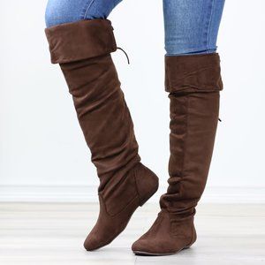 Fold Over Brown Thigh High Over The Knee Flat No Heel Boots Faux Suede Pointed