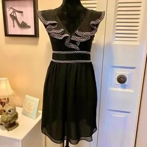 Adorable v-neckline semi sheer ruffled edge party dress by Emmelee.