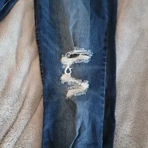 distressed Old Navy Rockstar jeans in size 8. There are several holes in the jeans including both knees