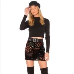 Like new black, steel blue, and burnt sienna red floral high waisted mini skirt. Fully lined and zips in back. Sold at Revolve. 7oz