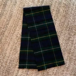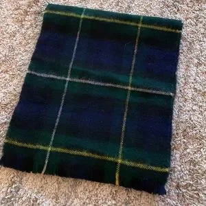 100% pure new wool scarf imported by scotch house. Green, blue, black, white, and yellow plaid. Vintage