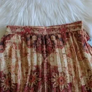 Gorgeous A-line pleated skirt by Anthropologie's Akemi+Kim. A bold all over print makes this boho-chic skirt a statement piece! Waist measures 13" (laid flat across back). Length approx. 26". Side zip. A stunning mix of cream, reds and orange.