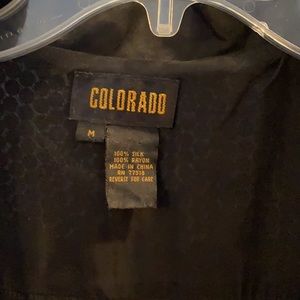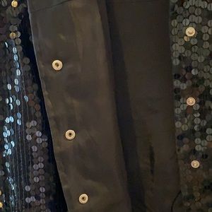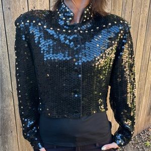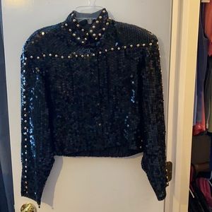 Colorado brand, size medium. Black sequin waist length jacket. Large beaded sun on back of jacket. Gold studs around Collar and down sleeves. Lined, snaps, gathered at waist.
