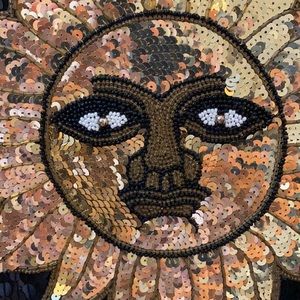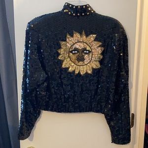 Black sequin jacket with beaded sun face on back ladies