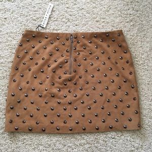 Alice + Olivia Suede Studded Mini Skirt, $598 Boho goes bad to the bone with this fierce miniskirt made from rich butterscotch-hued suede with allover cone studding that adds metallic flash. Exposed back-zip closure Stretch lining Leather Professional leather clean.