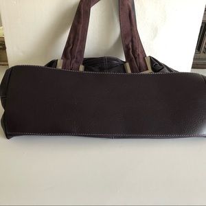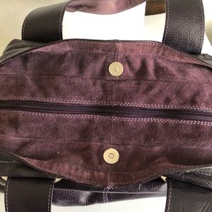 This beautiful bag is impeccably clean inside and out. Stored carefully but not used in the decade that I have owned it, it is in virtually perfect condition. There are no issues with this bag; you will be pleased. It is quite roomy, with a base of 6” x 16” and a height of almost 12 inches. The backs of the wide straps are purple suede as is the top of the bag, which can be closed with either a magnetic snap or with the full zipper. There is a center divider that zips from seam to seam, pockets for phone, glasses, etc and a zippered pocket inside the front panel. Hardware is brushed nickel. NOTE:Color in photos, especially on the suede areas, appears paler than the true, rich color of this bag
