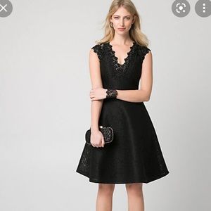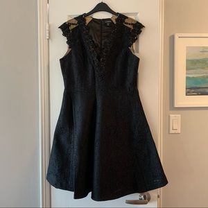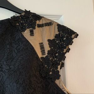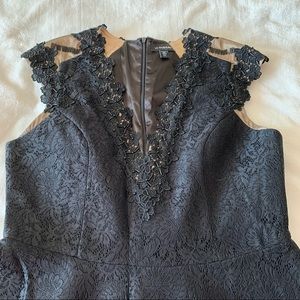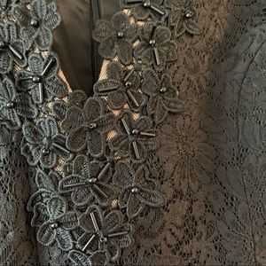 A gorgeous classy lace fit and flare dress. Such beautiful details, beading at the chest and shoulders, cap sleeves, v neck, fit and flare, fully lined. Has a few beads missing but is in overall perfect condition. Wore as a wedding guest dress only once. Great for a party, event, photos.