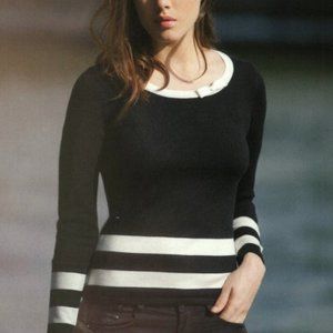 Leo Guy black & white classic, tzniut, elegant, modest, modern, long-sleeve top. Black base with 2 white stripes at the bottom of the top, sleeves, and white outline around the scoop neckline. Small white bow off to the side on the neckline.