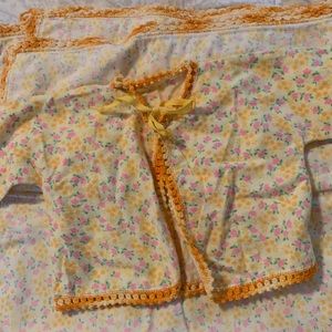 Cotton blanket and sweater with crochet detail. Sweater has ribbon tie closure. Blanket is 34”x34” square.