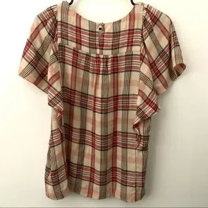 Maeve Anthropologie Plaid Short flutter sleeve. Keyhole cut out and button on backside of neck.