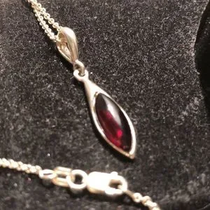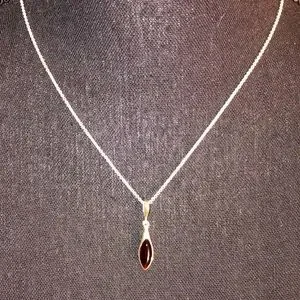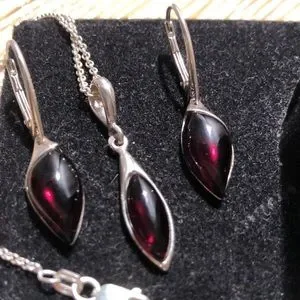 Genuine Dark Amber and silver earring set with matching lever back earrings. In excellent condition. 18 inch chain.