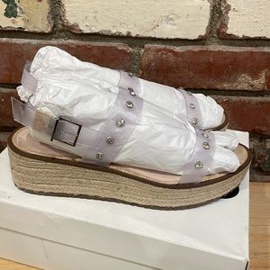 SCHUTZ Christiane Vinyl Studded Platform Wedge Sandal in Transparent/Almond Buff Get a leg up on glam in the Cristiane Sandal. This platform silhouette showcases see-through vinyl straps and delicate studding.