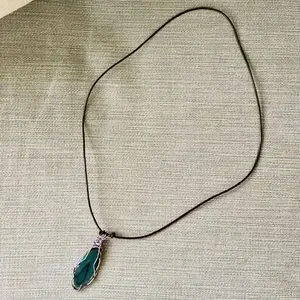 Color: Blue-green 3” oval agate set in decorative silver wire