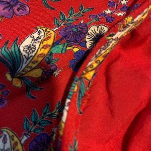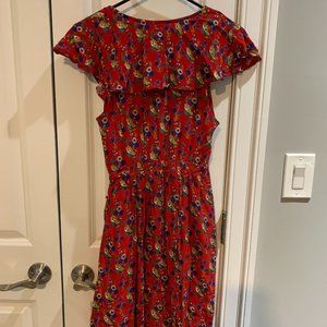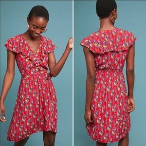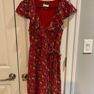 Anthropologie Red Floral Wrap Dress with cute flair on the chest. Good condition - missing easily replaced button for top closure