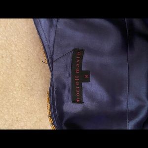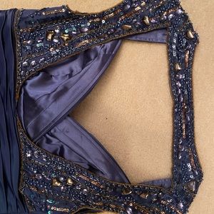 Blue dress size 8, with blue and gold beads across shoulders and front.Excellent condition wore one once.
