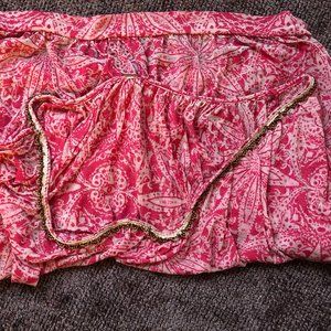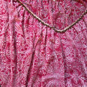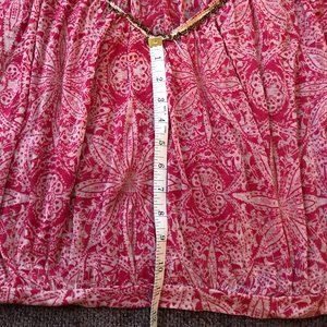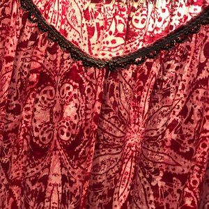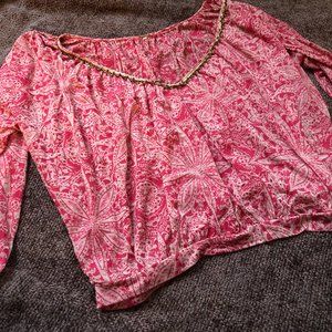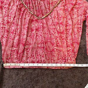 Free People Pink Pattern Top. Tags have been removed due to the sheer fabric. Size is small. Some measurements are shown. Loose fit, worn once or twice. Excellent condition, no rips/pulls/holes. All beading around neckline is intact. Fabric is stretchy. Elastic waist and sleeves.