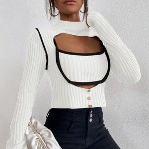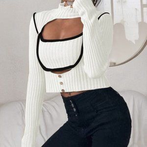 Modern Contemporary Ribbed Knit Cut Out Button Detail Sweater