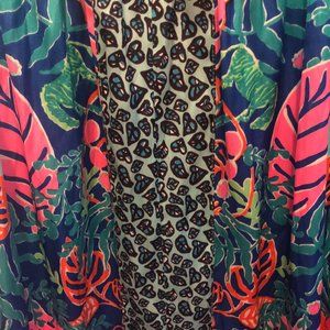 This is a small Lilly Pulitzer. It has a v-neck on the top, and also a pretty zebra with tropical leaves on the bottom. This dress is made of 100% Polyester, and it is a nice light dress. Never have been worn!