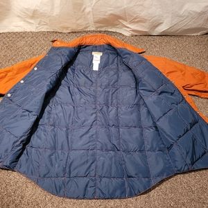 Vintage Frontline Kit Burnt Orange Jacket. These jackets came as kits and someone had to Sew them together. Ida Schmadeke put this one together. Nylon and down filled. One upper front flap pocket with snap. Horse shoes on flap. Snaps to close. Two snaps on cuffs. No size tag. Pit to pit 21", shoulder seam to shoulder seam 17", shoulder seam to cuff end 24" and neck seam to bottom back 27 1/2".