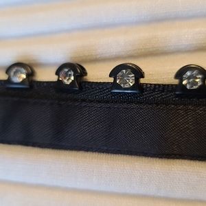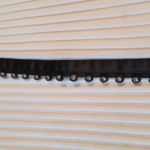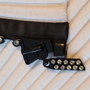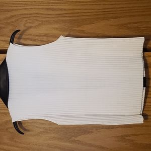 Ivory white tuxedo vest with sparkly stone zipper and black acetate collar and placket. I believe the XL size is a Junior, not Misses. There are very slight spots in a couple of places where I took photos, and the white is not a bright white. Stretchy and curve hugging.