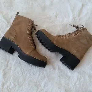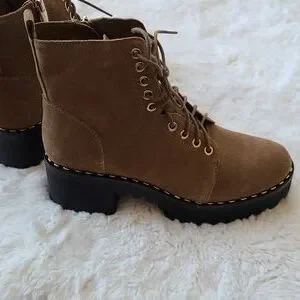NWOT Vince Camuto suede boots that are tan with gold hardware that ties in the front and has zippers on side...the heel is a lil over 2 inches