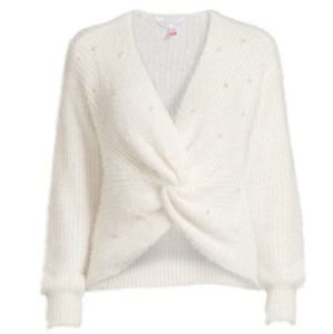 Junior's Front Twist Pull-Over Sweater with Faux Pearl Embellishment.