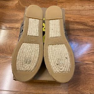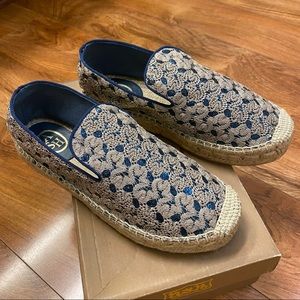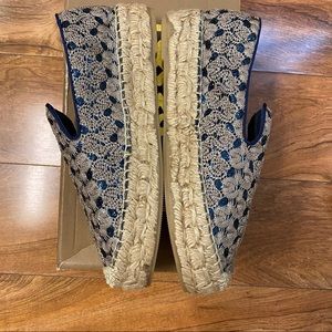 New, never worn. Leather lined. Height of platform sole measures 1”/2.5cm. Raffia fabric sole with embroidered and sequined upper. Due to the upper fabric, these espadrilles are very loose fitting.