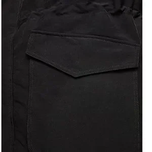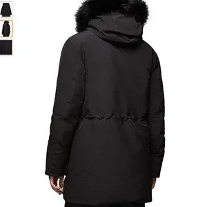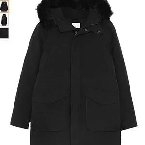Quilted coat with long sleeves and hood with detachable faux fur trim. Features two chest pockets, two patch pockets with snap buttons, elastic cuffs and lining with several inside pockets. Two-way zip and snap button fastening in the front hidden by placket.