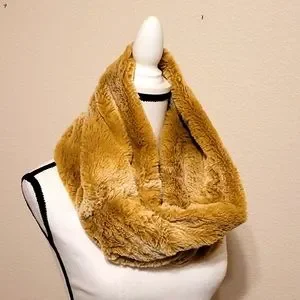 Beautiful tan gold double layer scarf. Very soft & classy. Measures 15" x 15", opening 36" around.