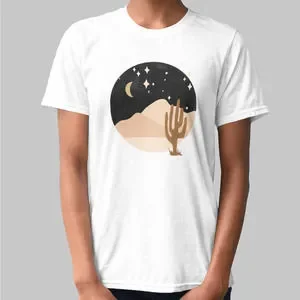 This tee features white 100% cotton, relaxed boyfriend fit, and round print of neutral mountainous desert at night with crescent moon and stars.