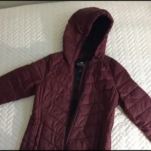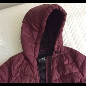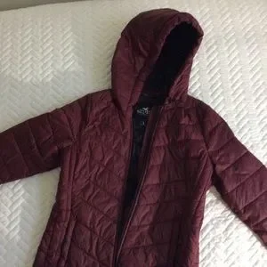 Hooded Hollister Jacket, zip front, toggle hood closure. About 24” long. Wine color burgundy
