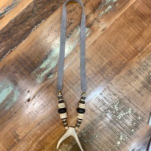 Need a conversation starter? Look no further! This neutral beauty and be worn with a tee or a dress! Gray genuine suede strap with a combo of bone, carved horn, coconut discs, smoky gray recycled glass and brass beads adorned with an antler fork pendant. This necklace is comfy around the neck and can be worn alone or with others! Drop length: 18”