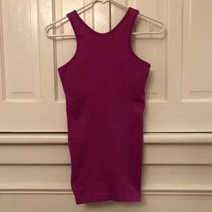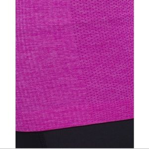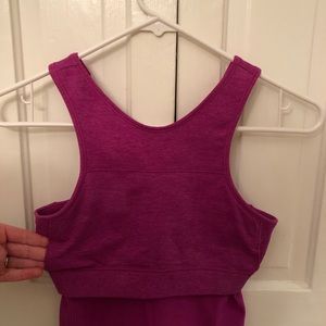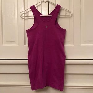 Lululemon Seamlessly Covered Tank, sweat-wicking fabric, seamless construction, body-mapped for ventilation in high-sweat areas, built-in bra with pockets for optional removable cups, color name is Heathered Ultra Violet, size 4