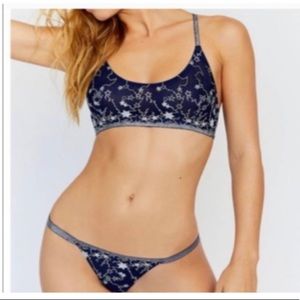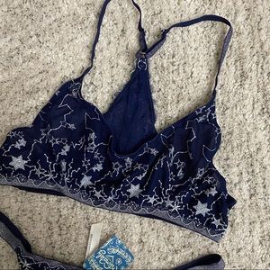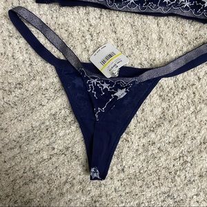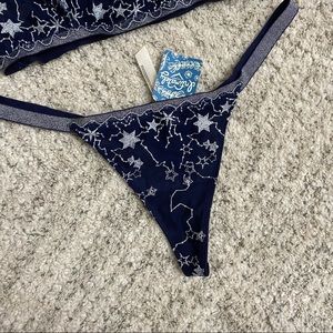 YOU NEED THIS!!! dark navy with silver metallic stars embroidering covering the front and back of the bralette and thong. these items are sold together