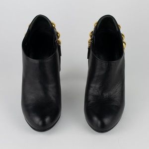 Rock this pair of glamorous, eye-catching Babouska Studded Ankle Boots from Gucci. Featuring all-around gold-tone and black studs around the back and heel, these ankle boots come in all black leather, almond-shaped toe, an exposed side gold-tone zipper, a French heel, suede lining at the back and leather lining throughout with an accompanied leather insole. Made in Italy.