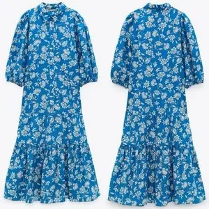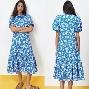 Button down. Puff sleeves. Ruffle hem. Floral print.