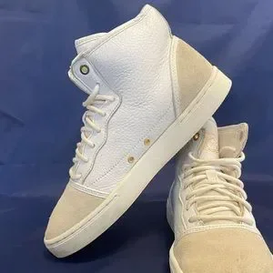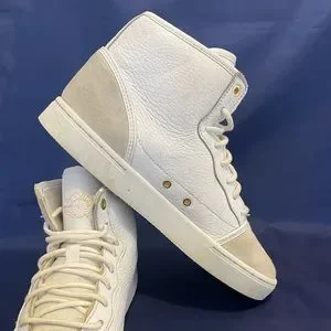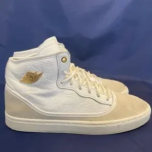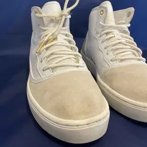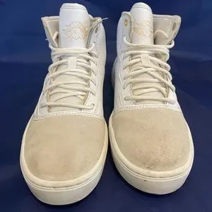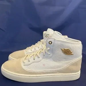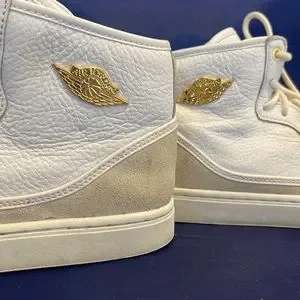 Nike Air Jordan 1 Jasmine GS White Gold Size 7.5y 7.5 Sneakers 768927-109. Used and no box. Scuffs and marks. Could use a clean. Size 7.5 youth which is equivalent to a men’s size 7.5. Still a cool pair of kicks!