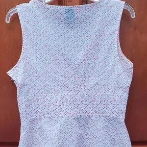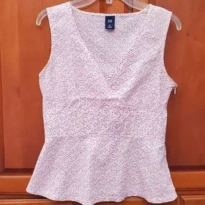 Adorable pink polka-dot peplum top. Side zipper in good working condition. DONATING 1/1/23 if not sold beforehand. K8T