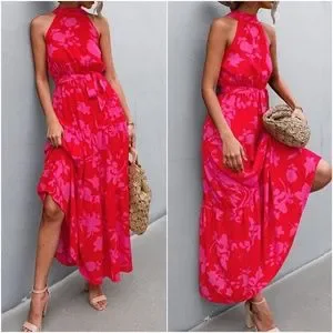 Boho Red Floral Print Halter Maxi Dress Cottagecore