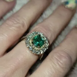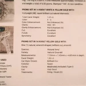 @lindsey624 The ring is brand new never worn. 48 diamonds 1.05 ctw of VS2-SI1 F-G color. Natural Emerald 1.83ct. Sells with the Insurance Appraisal document in the photos.