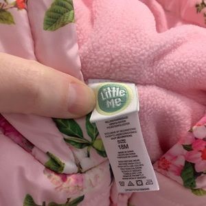 Little Me puffer jacket. Size 18 months. Has flowers and butterflies on it! Cinches at the waist with a bow that buttons over the zipper! Perfect condition. Really warm coat with a hood.