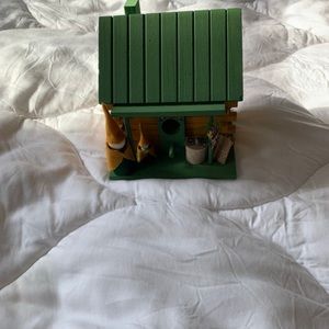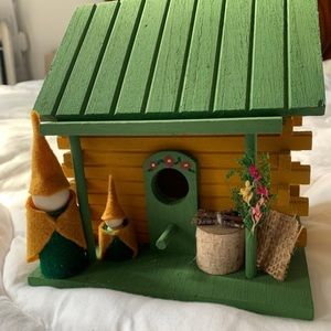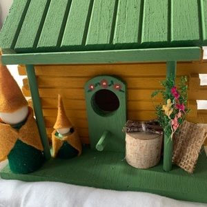 This beautiful hand painted birdhouse with the is the perfect addition to any yard or can be used as home decor as well! The house is painted in a beautiful mustard and green adorned with two peg dolls. There is a log with more pieces of wood, burlap sack, and hand painted flowers on the siding of the house !