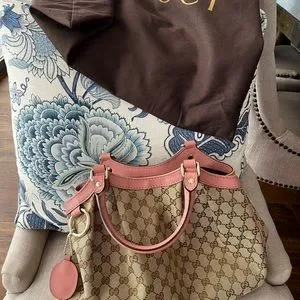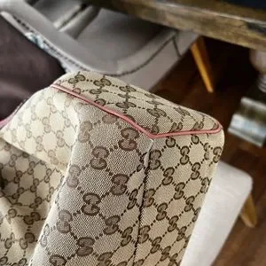 GG canvas and interlocking G logo. Gold tone hardware, pink leather trip. Dual shoulder straps. Canvas linging and single interior pockets, snap closure at the top. Dimensions 35W x24H x13D. Excellent preloved condition, barely used. Comes with dustbag and original receipt