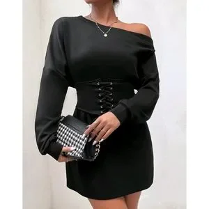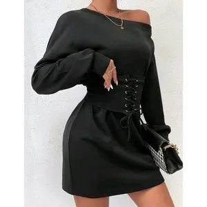 Asymmetrical Neck Sweatshirt Dress & Lace Up Corset