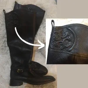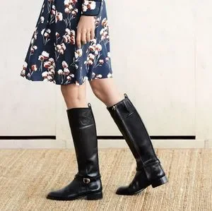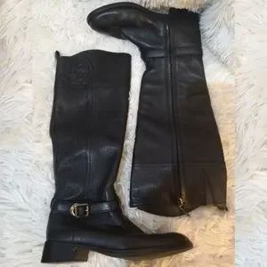 Black Tory Burch knee high riding boots. Pair with denim jeans, a button up shirt and your favorite blazer or with a lovely dress as pictured in the first image.